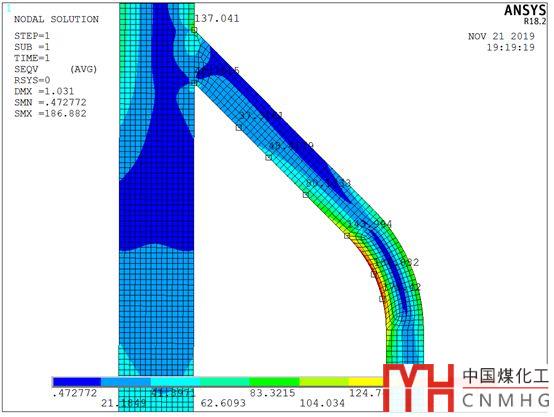 對于模型A,其最大應(yīng)力點(diǎn)在折邊內(nèi)壁處,為186.8MPa: