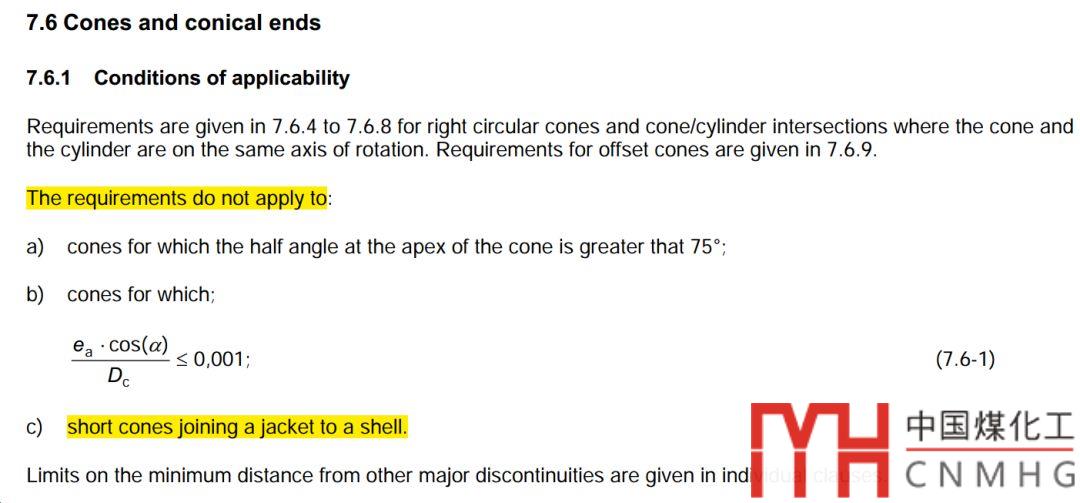 在EN13445.3中第7.6條,明確了夾套的錐體不適用于錐殼計(jì)算公式。