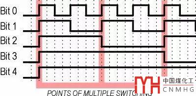 絕對(duì)編碼器(Absolute encoder)輸出的是一組二進(jìn)制數(shù)的編碼,它的碼盤(pán)被分成很多同心的通道,每一個(gè)通道,稱為一個(gè)“碼道”。每一個(gè)碼道都有一個(gè)單獨(dú)的輸出電路,用來(lái)表示一個(gè)二進(jìn)制的位。比如上圖中:最外邊的碼道表示第0位(Bit0),往里依次是第1位(Bit1)、第2位(Bit2)和第3位(Bit3)。碼道的數(shù)目越多,能測(cè)量的范圍就越大。下圖是碼盤(pán)轉(zhuǎn)動(dòng)時(shí),碼道輸出電路的波形圖: