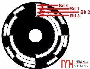 左邊是絕對(duì)編碼器的碼盤(pán),右邊是相對(duì)編碼器的碼盤(pán)??梢钥闯?,相對(duì)編碼器碼盤(pán)的光柵是均勻分布的,而絕對(duì)編碼器的碼盤(pán)被分成了很多大小不等的帶,下面這張圖也許能看的更清楚一些:
