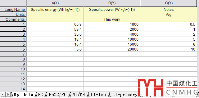 如上圖所示,數(shù)據(jù)表由多個sheet組成,分別是:My data、EC、PbO2/Pb、Ni/MH、Li-ion、Li-primary、Capacitor和t-lines。