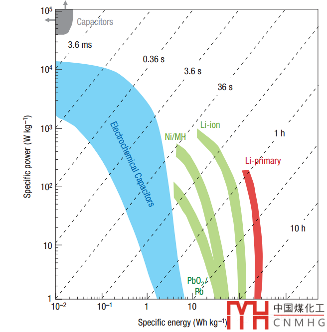 圖中的條帶是不同類型的化學(xué)電源功率密度與能量密度的變化范圍,來源于文獻(xiàn)數(shù)據(jù)。從上圖中我們可以直觀地了解以下幾個信息: