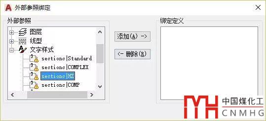 輸入XBIND命令后,回車,會彈出“外部參照綁定”對話框。對話框中會顯示當(dāng)前圖中的已插入的外部參照,單擊參照名稱下的加號,可以顯示可綁定的數(shù)據(jù)類型,單擊數(shù)據(jù)類型前的加號,可以顯示外可綁定的設(shè)置,如下圖所示。