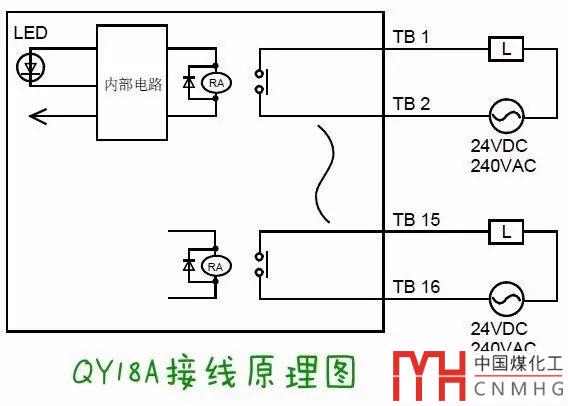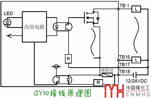 QY50的接線(xiàn)原理圖如下(TB18接0V,TB17接+24V):