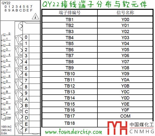 QY22有16路輸出,其隔離方式為光電隔離;使用18點(diǎn)端子排(TB1~TB18),TB17為公共端,TB18保留;負(fù)載的電壓范圍100v AC~240v AC,每一通路最大輸出電流0.6A ,公共端(TB17)最大承載電流4.8A;當(dāng)所有的通道均處于接通(ON)狀態(tài)時(shí),模塊消耗基板5V電流250mA。下面是QY22的端子分布與軟元件對(duì)應(yīng)圖: