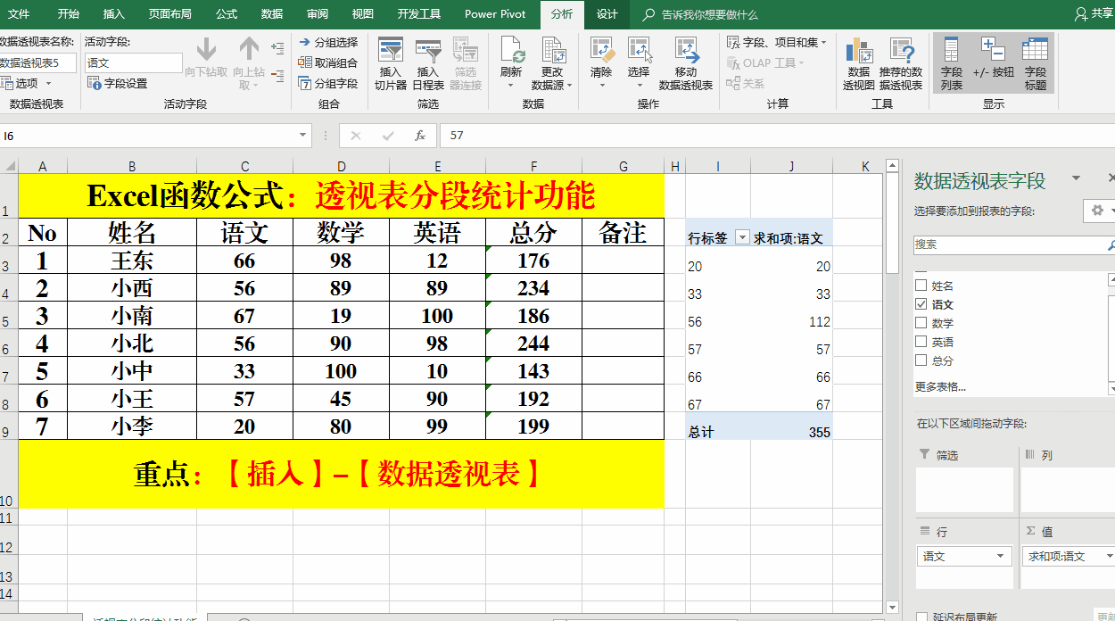 4、將【數(shù)據(jù)透視表字段】中的【語文】字段拖動到【行】和【值】。