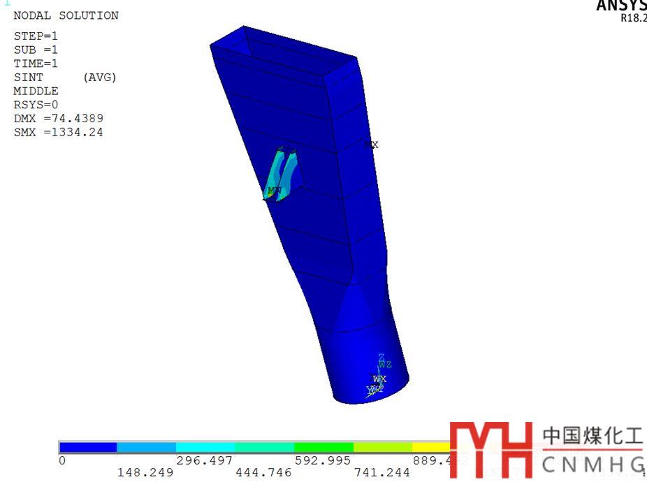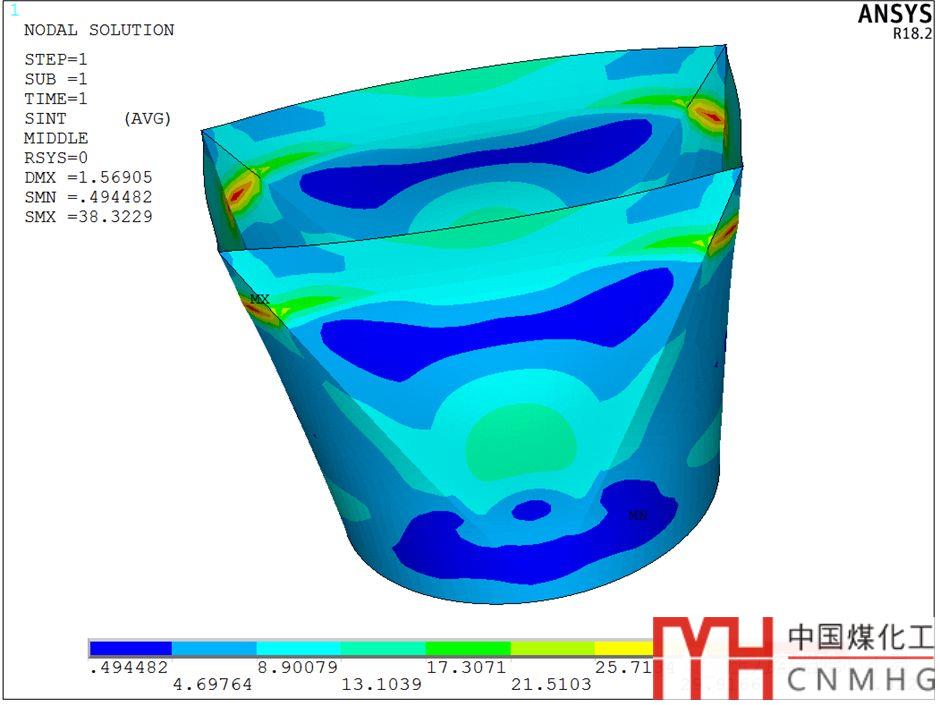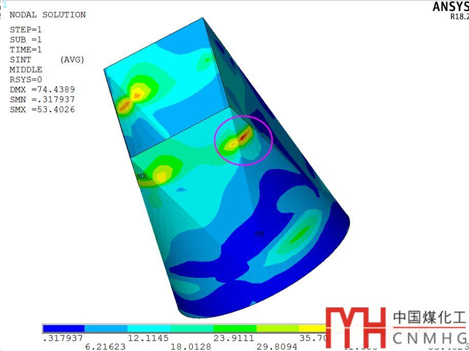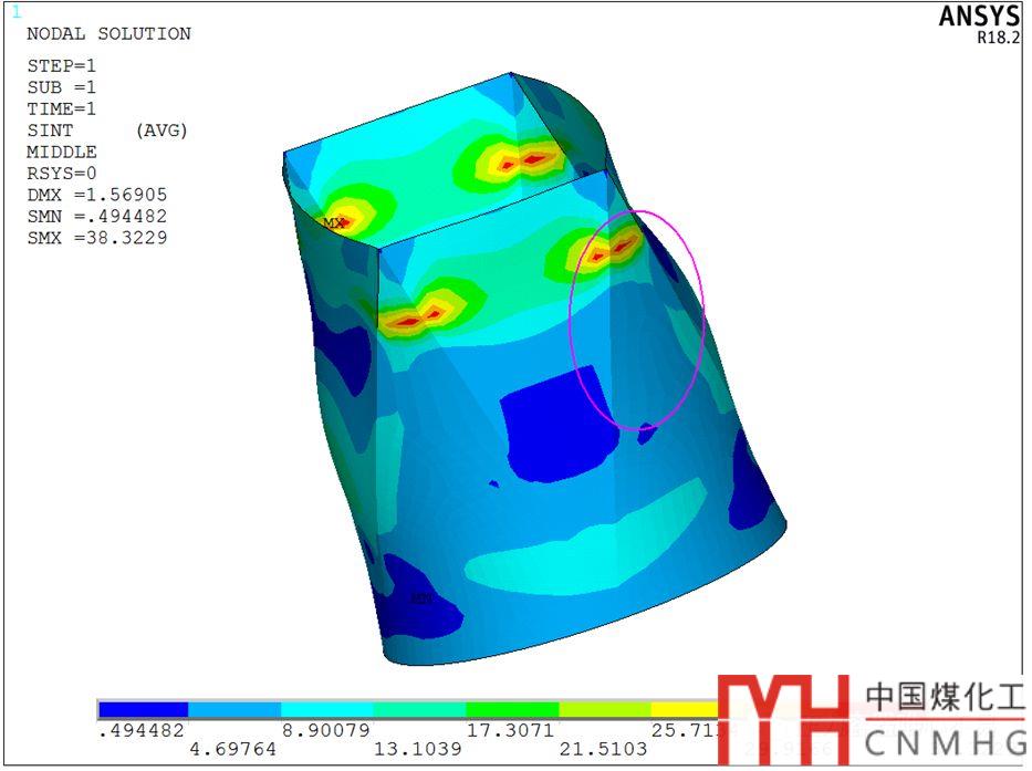 檢查一下天圓地方處,其計算結(jié)果基本處于對稱狀態(tài)。由剛才的53.4MPa,變成了38.32MPa。