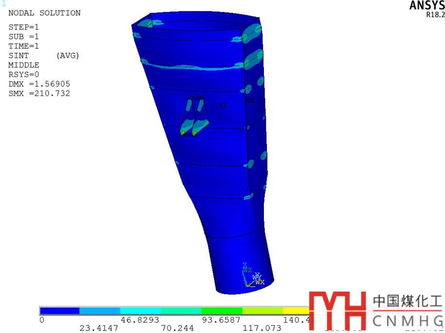 為了試驗,不再單獨(dú)修改這三面的壓力,全選設(shè)備殼體后,統(tǒng)一施加內(nèi)壓載荷。運(yùn)行后,最大位移1.569mm,最大薄膜應(yīng)力210.732MPa。