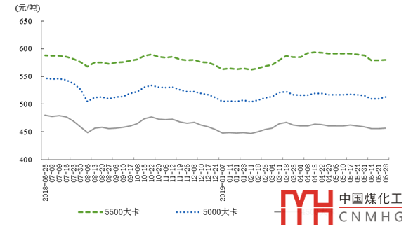 6月28日,秦皇島5500大卡煤炭綜合交易價(jià)格為每噸580元,5000大卡為每噸513元,4500大卡為每噸457元,比5月31日分別下跌8元、2元和2元。
