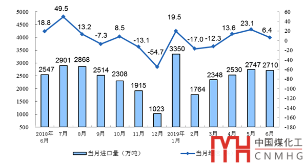 6月份,進(jìn)口煤炭2710萬(wàn)噸,同比增長(zhǎng)6.4%;上半年進(jìn)口煤炭1.54億噸,同比增長(zhǎng)5.8%,一季度為下降1.8%。