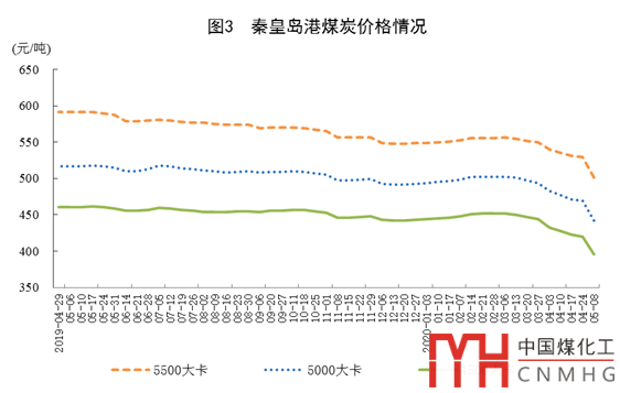 煤炭進口增長較快,交易價格有所下跌。4月份,進口煤炭3095萬噸,同比增長22.3%;1-4月份,進口煤炭1.3億噸,同比增長26.9%。港口煤炭綜合交易價格繼續(xù)下跌,5月8日秦皇島港5500、5000和4500大卡煤炭價格分別為每噸501元、442元和396元,比4月3日分別下跌39元、41元和36元。