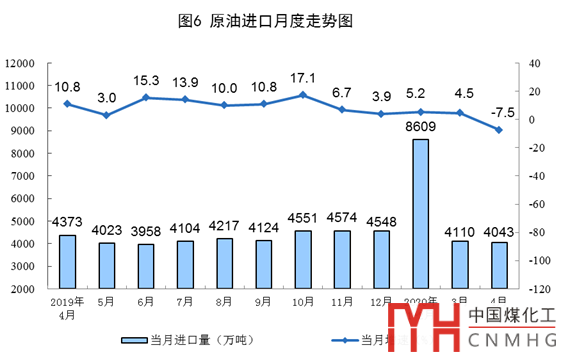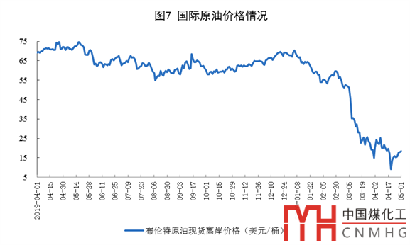 原油進口下降,國際原油價格低位震蕩。4月份,進口原油4043萬噸,同比下降7.5%。1-4月份,進口原油16761萬噸,同比增長1.7%。4月30日布倫特原油現(xiàn)貨離岸價格為18.11美元/桶,比3月31日的14.85美元/桶上漲22.0%。