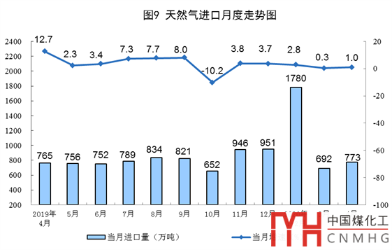 天然氣進口小幅增長。4月份,進口天然氣773萬噸,同比增長1.0%。1-4月份,進口天然氣3233萬噸,同比增長1.5%。