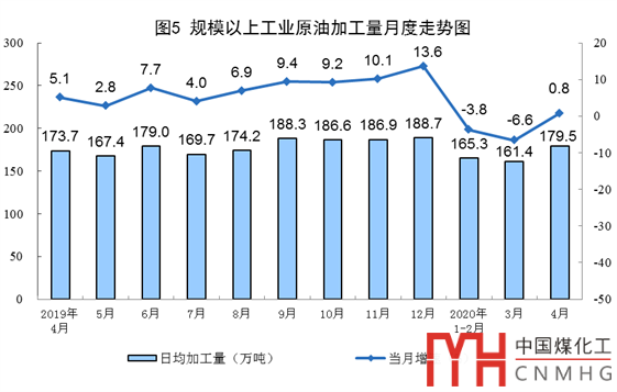 原油生產(chǎn)平穩(wěn),加工量由降轉增。4月份,生產(chǎn)原油1587萬噸,同比增長0.9%,增速由負轉正,上月為下降0.1%,日均產(chǎn)量52.9萬噸;加工原油5385萬噸,同比增長0.8%,上月為下降6.6%,日均加工179.5萬噸。1-4月份,生產(chǎn)原油6444萬噸,同比增長2.0%;加工原油20348萬噸,同比下降3.4%。