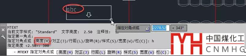 輸入T回車執(zhí)行多行文字命令并指定多行文字第一點(diǎn)已后,命令行會顯示一些參數(shù),很多時候我們都會忽略,其實(shí)這里就有高度的選項(xiàng),輸入H,回車,就可以先設(shè)置好文字高度,如下圖所示。