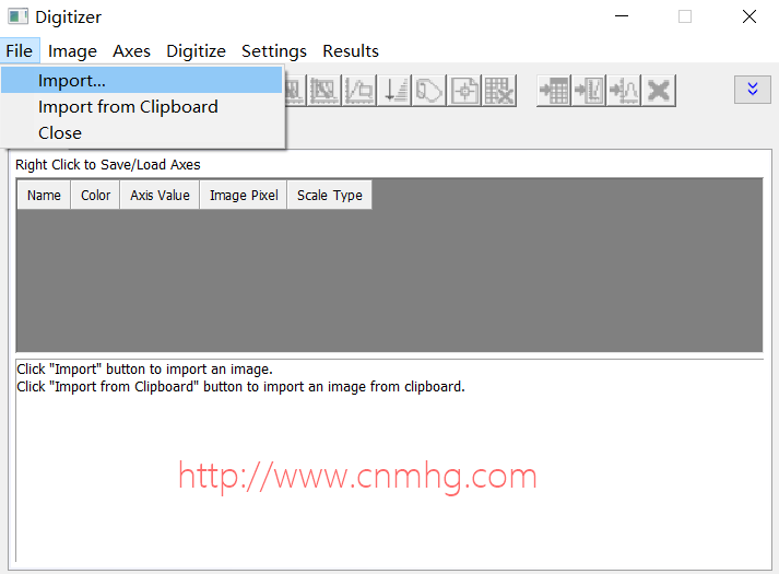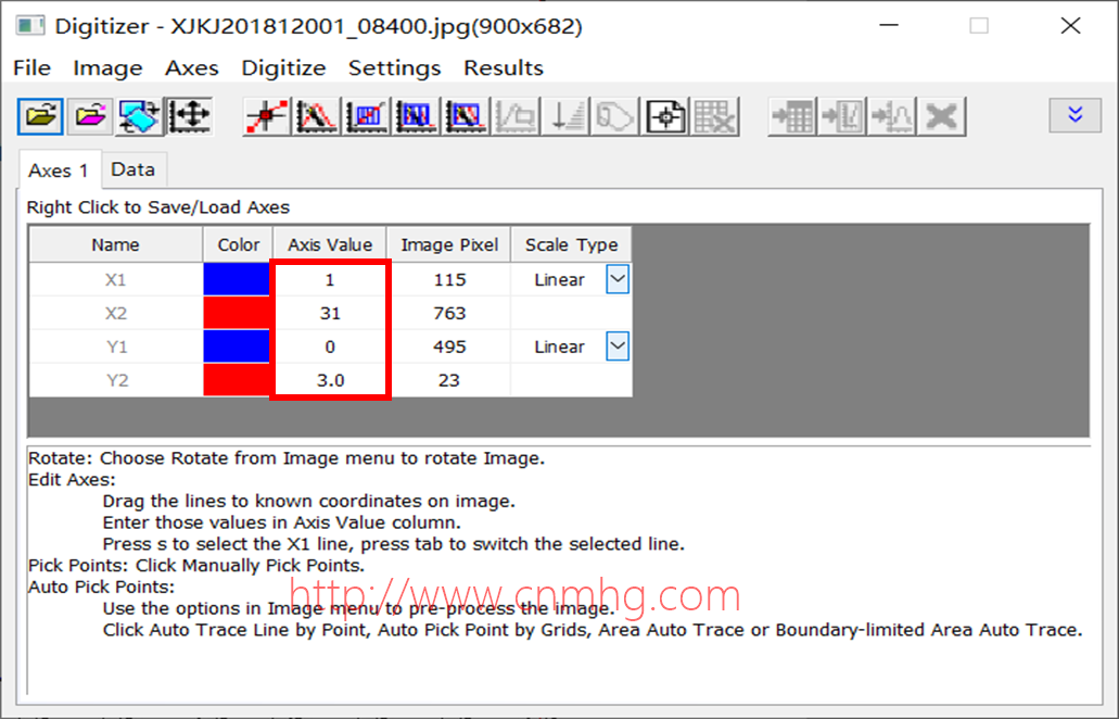 Step3:默認(rèn)進(jìn)入坐標(biāo)軸設(shè)置界面,通過點擊拖動的方式可以調(diào)節(jié)紅線和藍(lán)線(藍(lán)為原點,紅為終點)與圖像中坐標(biāo)軸重合,用來定標(biāo)點的位置,然后在Axis Values中設(shè)置坐標(biāo)起點和終點代表的數(shù)據(jù)值;
