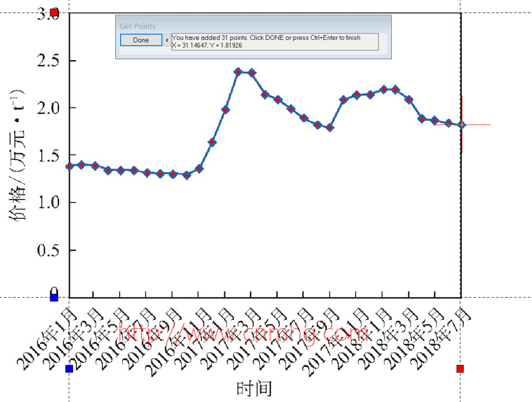 圖片可以把數(shù)據(jù)的大小、趨勢等信息直觀地展示在我們面前,尤其是PPT匯報和答辯的時候,良好的繪圖習(xí)慣可以給人以舒爽的感覺。繪圖的前提是要有數(shù)據(jù),但很多文獻(xiàn)和某度的數(shù)據(jù)都是以圖片形式給出的,清晰度或者繪制方法與上下文不搭,如何才能相對客觀地把圖片中的數(shù)據(jù)信息提取出來?用尺子測量的方法,貌似初高中考幾何題還管用,但看的時候總是有很強的主觀性。Origin里面的Digitizer功能可以圓滿解決上述問題!以2016-2018年我國聚異戊二烯橡膠市場價格圖為例(數(shù)據(jù)來源:崔小明.國內(nèi)外聚異戊二烯橡膠市場分析),展示具體操作步驟。