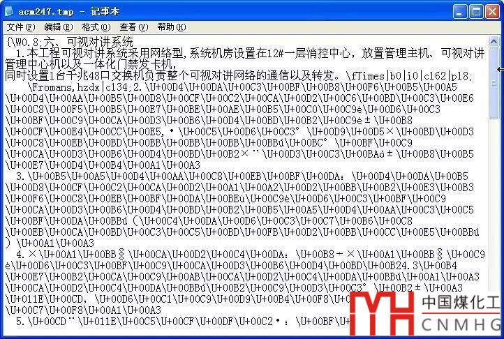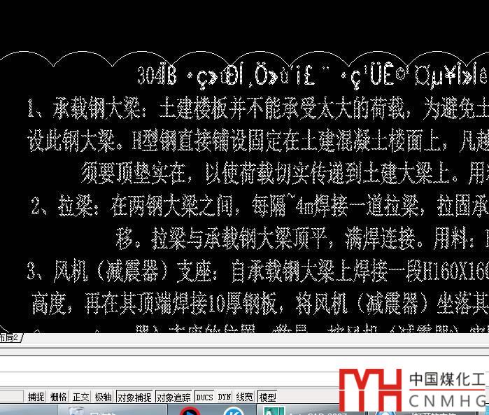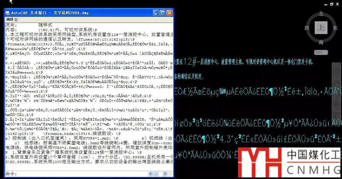 可以看到這段文字的前面和后面都是中文,中間一段即使在查詢的文本窗口中也顯示為亂碼,也就是說這些文字的編碼已經(jīng)錯(cuò)誤,CAD已經(jīng)無法正常識(shí)別了。我們換個(gè)低版本,如2004打開圖紙并查看一下一下文字內(nèi)容,看到的會(huì)不一樣,如下圖所示。