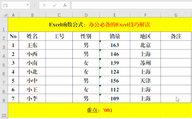 1、在第一個目標(biāo)單元格中輸入:'001。