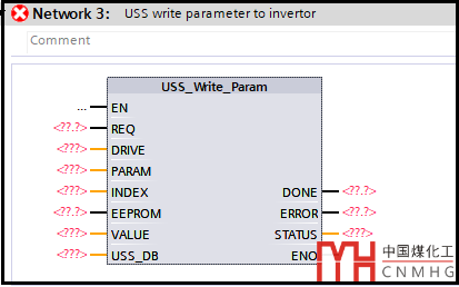在指令列表中找到“通信(Communication)”-“通信處理器(Communication processor)”-“USS通信(USS communication)”,將USS_Write_Param拖放到程序塊中。如下圖: