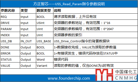 USS_Read_Param指令用來實(shí)現(xiàn)對變頻器參數(shù)的讀取。通過不同的參數(shù)號及參數(shù)索引來實(shí)現(xiàn)對不同參數(shù)的讀取,最多支持16個變頻器。
