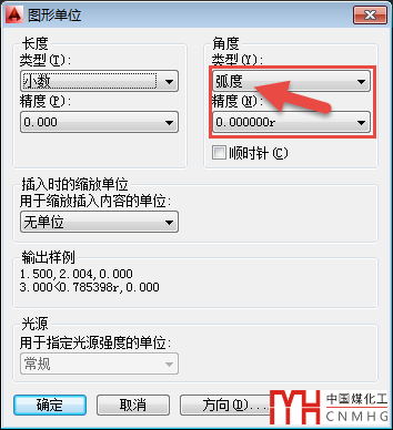 輸入UNITS,打開單位對話框,可以看到角度的單位設(shè)置確實用的是弧度,如下圖所示。