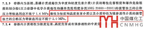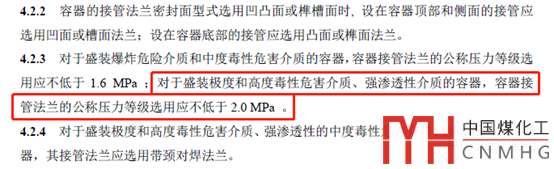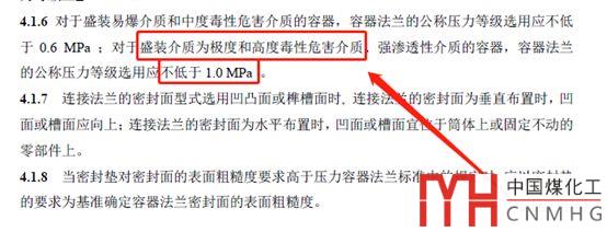 新HG/T 20583《鋼制化工容器結(jié)構(gòu)設(shè)計(jì)標(biāo)準(zhǔn)》(審查稿)的4.16要求盛裝極度高度危害介質(zhì)、強(qiáng)滲透性介質(zhì)的容器法蘭公稱壓力等級(jí)不低于1.0MPa,如下圖。這條在現(xiàn)行的HG/T 20583-2011是沒有的,為新標(biāo)準(zhǔn)審查稿新增。