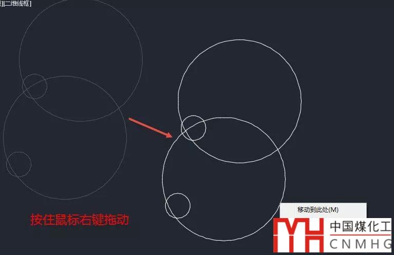 在選中圖形后,鼠標(biāo)停留在圖形邊界上,按住鼠標(biāo)右鍵拖動,圖形會跟隨移動,松開右鍵的時候會彈出一個菜單,可以選擇移動、復(fù)制或粘貼為塊,如下圖所示。