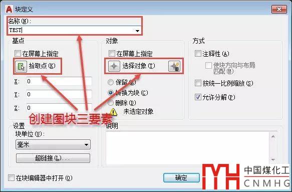 創(chuàng)建塊的快捷鍵是B,是最常用的創(chuàng)建圖塊的方法。我們可以先選擇要定義成圖塊的圖形,也可以執(zhí)行命令后再選擇,執(zhí)行命令后會彈出一個創(chuàng)建塊的對話框,這個對話中必須定義兩個要素是選定的圖形和圖塊名,但千萬不能忘記的是指定合適的基點(diǎn),其他參數(shù)如果沒有特殊需要可以忽略,如下圖所示。