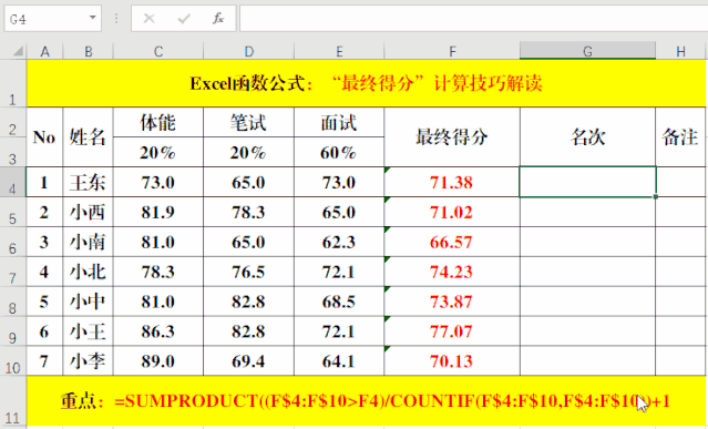 四、對“最終得分”排名:Sumproduct函數(shù)法。