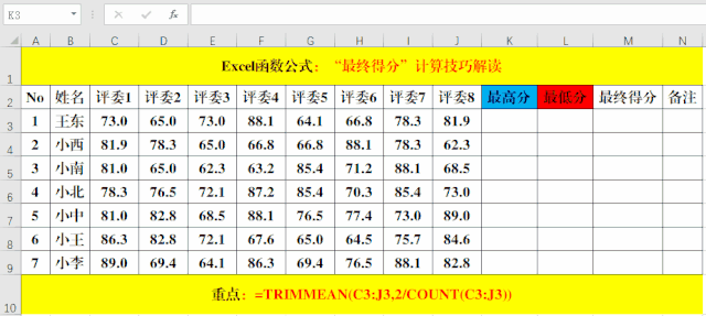 一、Excel計算“最終得分”:Trimmean函數(shù)法。