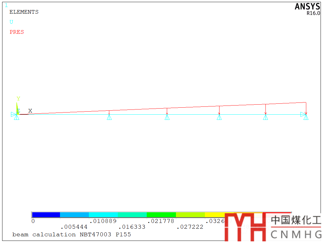 首先選擇了平面桿單元BEAM3,由于只是為了求支反力,所以梁的尺寸并不重要,只要加強(qiáng)梁的位置即約束的位置正確,施加的是三角形的液柱靜壓力即可。