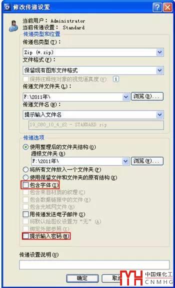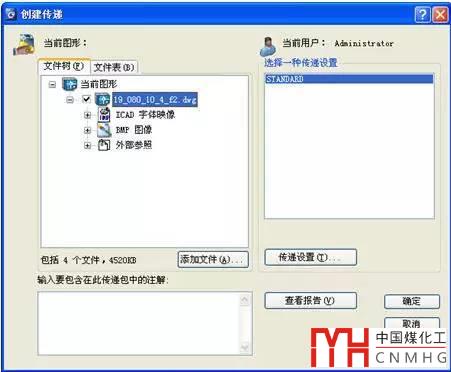 可以看到電子傳遞功能默認(rèn)內(nèi)容不僅包含圖紙文件,還包括字體映像文件,圖紙中插入的光柵圖像和外部參照?qǐng)D紙。右側(cè)下拉框中的STANDARD是電子傳遞的設(shè)置,我們可以修改這個(gè)設(shè)置或添加新的設(shè)置。在左下的輸入框內(nèi)可以填入簡(jiǎn)單的說(shuō)明文字,這些說(shuō)明文字將被寫入到一個(gè)文本文檔內(nèi),和圖紙相關(guān)文件一起打包。