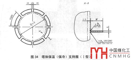 SH/T3098-2011的7.14給出了幾種塔器保溫支撐圈的型式,分別為塔頂封頭(7.14.3 a,稱II型)、塔體(7.14.3b,稱I型),以及裙座上部靠近底封頭處(7.14.3 c,稱III型)的保溫圈,見下文的幾個(gè)附圖,這三種保溫圈還可以分為可拆式、不可拆式的,共計(jì)六種保溫圈。