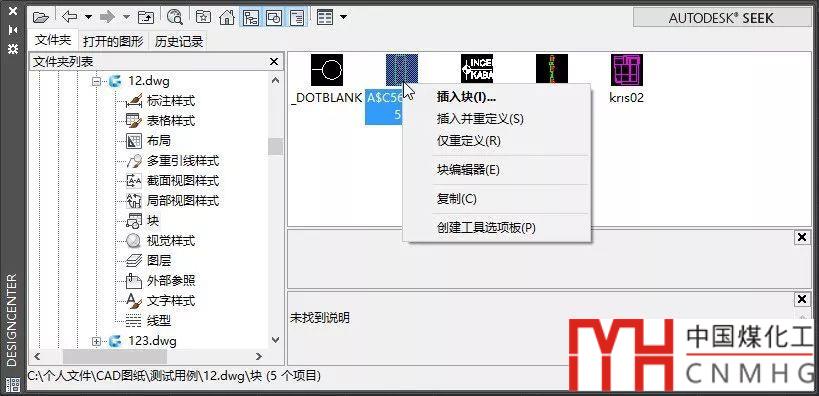 在設(shè)計中心中可以插入塊,如果圖中有同名的圖塊,可以對圖塊進行重定義,還可以直接打開塊編輯器直接修改或直接創(chuàng)建工具選項板。
