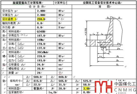 從下圖可以知道筒體法蘭采用的是殼程設(shè)計溫度,殼程的my值,殼程材料,2MPa的設(shè)計壓力。