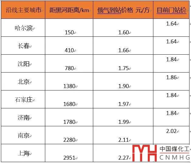 以大慶為起點(diǎn),中俄東線途徑各主要城市大概輸送至門站的價(jià)格大致如下: