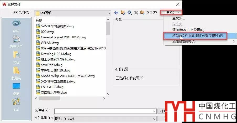 一種方式是先在查找范圍中瀏覽到圖紙所在的文件夾,然后將這個文件夾添加到位置列表中,添加的方法有兩種,一種是在位置列表的右鍵菜單中選擇“添加當前文件夾”,還有一種方法是在右上角的工具下拉菜單中選擇“將當前文件夾添加到“位置”列表中”,如下圖所示。