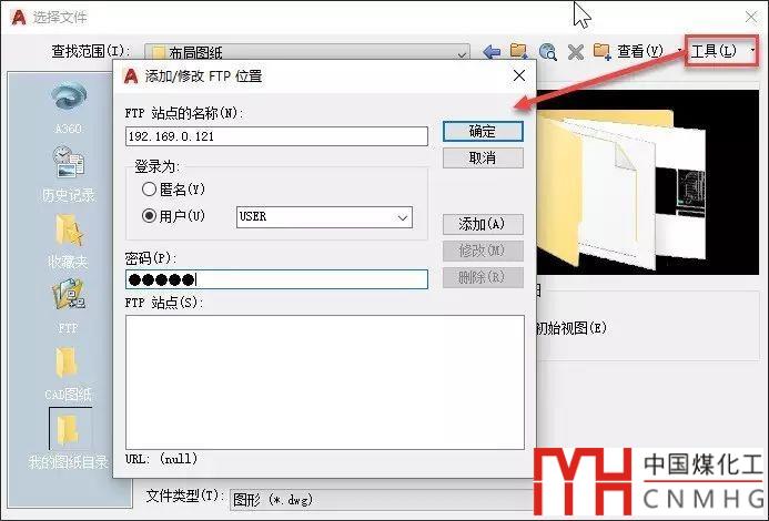 如果圖紙文件放到FTP服務(wù)器行,我們可以先用FTP下載工具下載到本地,也可以直接從CAD里打開,只需在對話框的"工具"下拉菜單中設(shè)置好FTP地址,就可以直接在左側(cè)列表中單擊FTP,顯示并打開FTP服務(wù)器上的圖紙文件了。