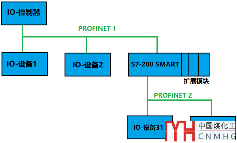 另一種情況是S7-200 SMART既作為上級IO控制器的智能設(shè)備,又作為下級PROFINET網(wǎng)絡(luò)的IO-控制器,如下圖所示: