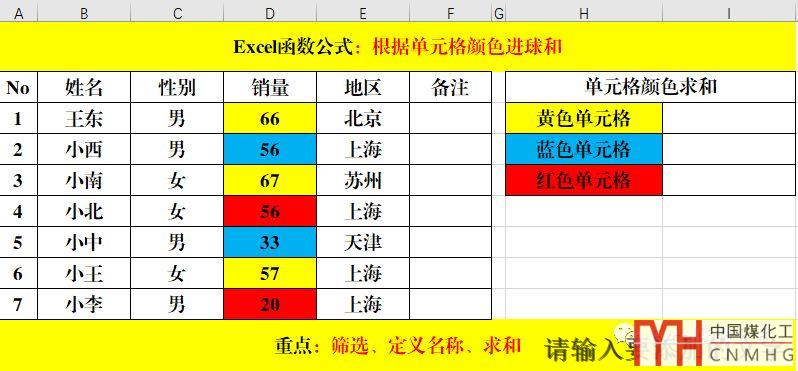 1、公式:=Sum(黃色)中的“黃色”為定義的名稱。要靈活應用,不可死搬硬套哦!