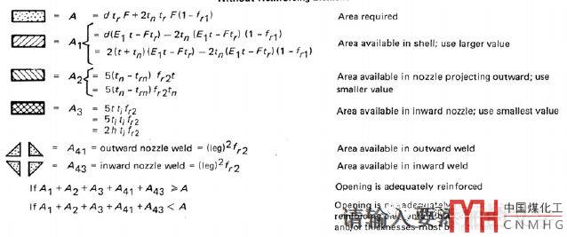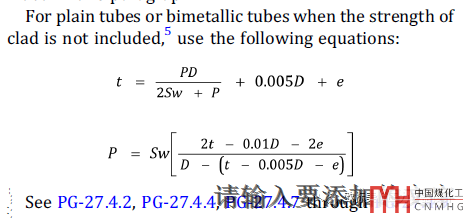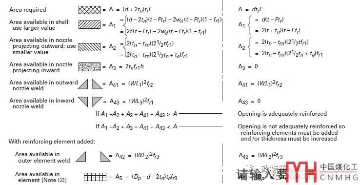 PG篇的內(nèi)容編排基本對(duì)應(yīng)UG篇,區(qū)別PG19,PG20把材料冷成型的熱處理放在PG部分了。例如UG-99是水壓,PG-99也是水壓。有些會(huì)有微小的差別制造UG-77開始,PG-75開始。1)內(nèi)壓計(jì)算在PG27計(jì)算公式和UG27的計(jì)算公式有較小的差別,計(jì)算厚度會(huì)有微小的差別。2)外壓計(jì)算PG28和UG28幾乎沒用差別,只是在step3中許用應(yīng)力的取值上會(huì)有差別Ⅰ卷有時(shí)會(huì)是1.8倍屈服而Ⅷ-1卷是0.9倍屈服。3)開孔補(bǔ)強(qiáng)PG-33對(duì)應(yīng)UG-37:開孔補(bǔ)強(qiáng)計(jì)算的公式實(shí)際上是一樣的但表達(dá)公式不一樣(詳見下圖)。4)接管最小厚度要求PG-43對(duì)應(yīng)UG-45。5)水壓試驗(yàn) PG-99對(duì)應(yīng)UG-99,這部分是有較大區(qū)別的水溫要求20℃以上,試驗(yàn)壓力為1.5倍MAWP。因?yàn)橛昧薓AWP就直接說一下重要的區(qū)別在Ⅰ卷中MAWP≤設(shè)計(jì)壓力(在PG-106.3有描述"...the maximum allowable working (minimum design) pressure at the superheater outlet...")6)檢查孔 PG-44檢查孔的要求和UG-46差別很大:橢圓形人孔不小于300mmx400mm;圓形人孔不小于380mm;手孔開孔面積不小于70mm x 80mm 。7)標(biāo)記和銘牌:在PG-105和PG106,PG-105鋼印樣式很多:S--蒸汽,M-小 E--電 A--安裝 PP--管道 V--閥門 PRT--部件;PG-106銘牌的樣式、要求和Ⅷ-2卷銘牌很像,字高也都是最小8mm(小鍋爐除外)。8)其他;PG-38有聯(lián)合補(bǔ)強(qiáng)等要求;變形率的計(jì)算在PG-19,碳鋼熱處理要求在PG-20等;PG-5~PG-14是材料要求;PG-16開始是設(shè)計(jì)內(nèi)容,其中PG-22是載荷描述的不像UG-22那么清楚但是也是要考慮載荷組合等的。