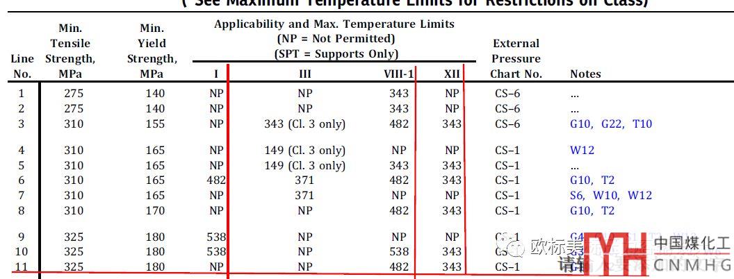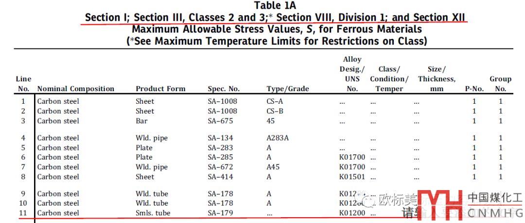 計(jì)算中是要用到材料的許用應(yīng)力的;允許的材料,許用應(yīng)力都是Ⅱ卷D篇1A的表(Ⅷ-1卷,Ⅰ卷,Ⅲ核2級(jí)和3級(jí),Ⅻ卷等)但是要注意有些材料在Ⅷ-1是允許使用的,Ⅰ卷是不能使用的.例如SA-179;還要注意即使是都可以使用的材料使用溫度上限有時(shí)也是不一樣的例如SA-516 70:Ⅰ卷允許的上限是454℃,Ⅷ-1是538℃。(SA-516 70的就不截圖了)