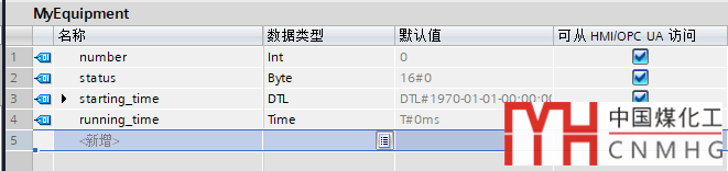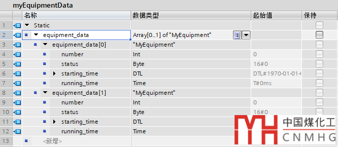 創(chuàng)建全局?jǐn)?shù)據(jù)塊myEquipmentData,新建名稱(chēng)為"equipment_data"的數(shù)組,數(shù)據(jù)類(lèi)型為"myEquipment",如下圖所示: