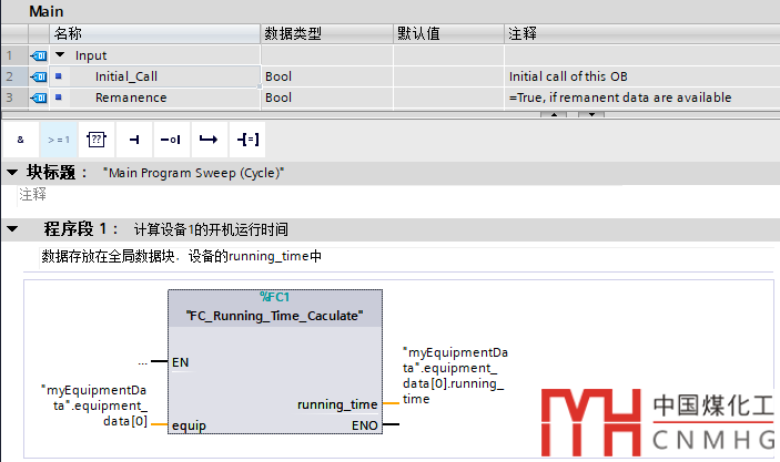 在主程序塊(OB1)中調(diào)用FC_Running_Time_Caculate,計(jì)算設(shè)備的實(shí)際運(yùn)行時(shí)間;