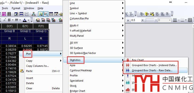 繪制圖形:使用Plot菜單或者右擊->Plot->Statistics->Boxplot來繪制。不同的數(shù)據(jù)類型,選則不同的繪制模板。