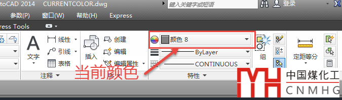 當(dāng)時我決定有點(diǎn)奇怪,還以為是他的天正改了什么設(shè)置,讓他只啟動AUTOCAD看一下,結(jié)果還是如此。圖紙發(fā)過來后才發(fā)現(xiàn)原來原因這么簡單,只是因?yàn)樗漠?dāng)前顏色設(shè)置成了8號色,如下圖所示。