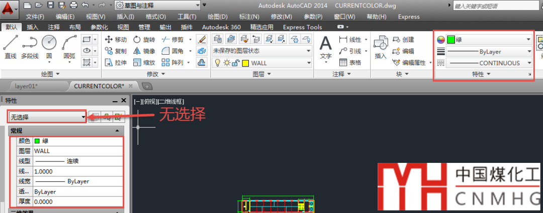 其實(shí)顏色、線型、線寬等也可以設(shè)置當(dāng)前值。如果我們在沒有選擇任何圖形的狀態(tài)下在工具欄或特性面板中修改了這些特性值,就是設(shè)置了這些特性的當(dāng)前值,后面繪制的圖形就會直接使用這些特性,如下圖所示。