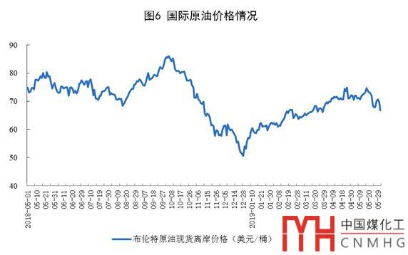 國際原油價格下跌。5月31日,布倫特原油現(xiàn)貨離岸價格為66.8美元/桶,比4月30日下跌5.4美元。