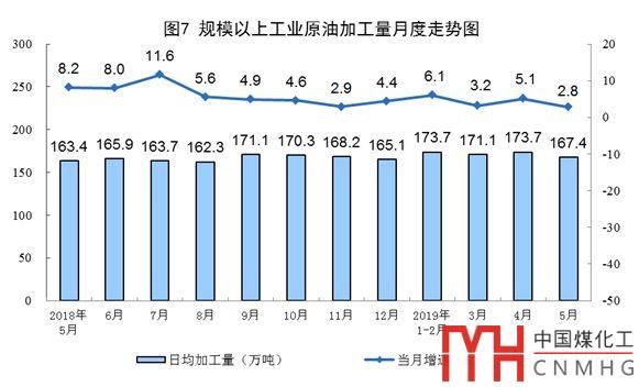 5月份,加工原油5190萬噸,同比增長2.8%,增速較上月回落2.3個百分點;日均加工167.4萬噸,比上月減少6.3萬噸。1—5月份,原油加工量25949萬噸,同比增長4.4%。